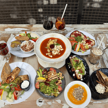 Salaattia, uuniperuna- ja tortilla-annoksia, sekä herkullisia