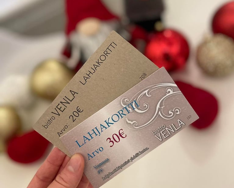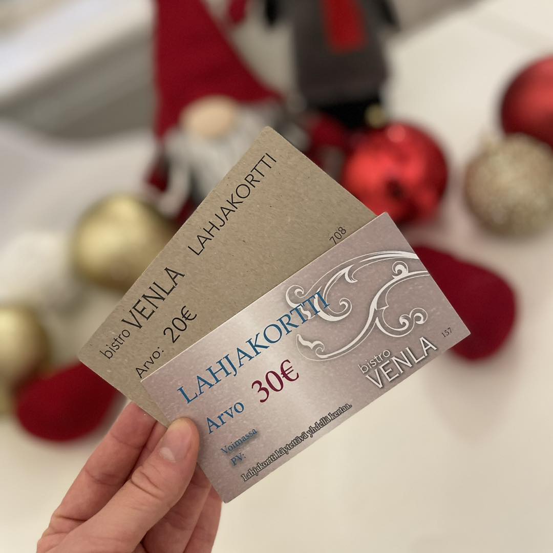 Saatavilla on 20€ ja 30€ lahjakortteja.